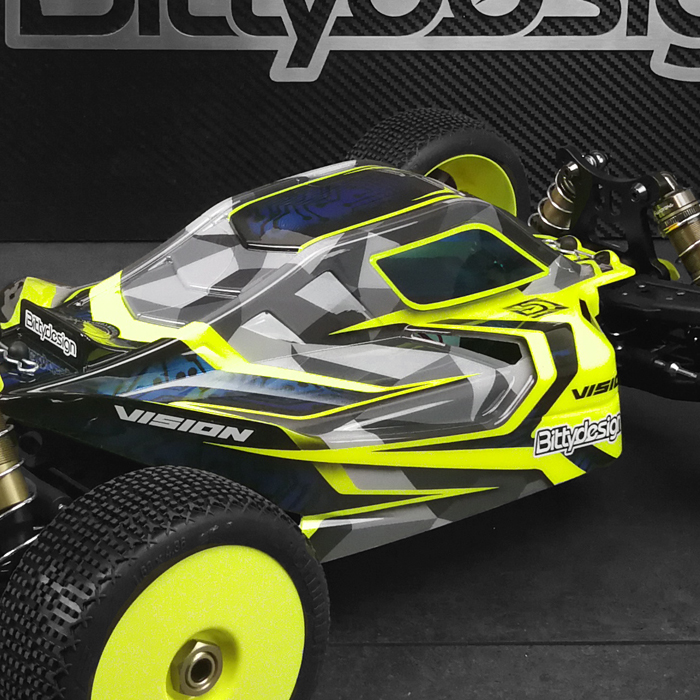 VISION is a body with a futuristic look that enhances the performance of the model, several hours of development and research have been dedicated to the sides that show a unique and original design of its kind and that are perfectly connected with the rear side flaps that guarantee the correct load aerodynamically optimized also thanks to the showy central flap that guarantees the correct air flow to the wing, all these elements have been specially designed to generate stability and improve the rear traction as well to make the model balanced and easy to drive.