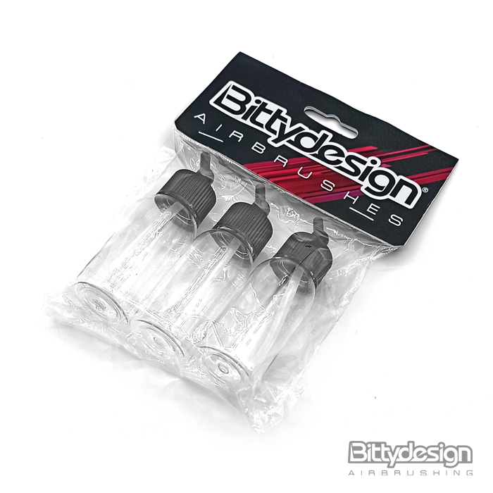 Set di 3 flaconi per aerografo da 60ml, il tappo in plastica include l' adattatore con angolo di 30° verso il basso. Da utilizzare con il nostro aerografo Michelangelo a doppia azione ad innesto rapido.